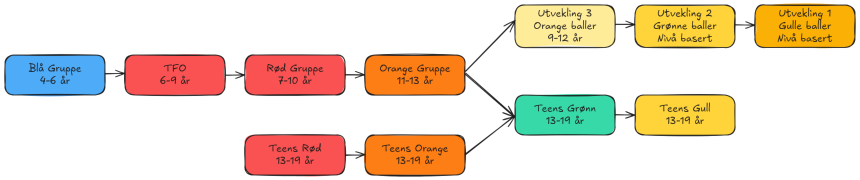 Vi følger NTPFs anbefaling om bruk av mykere baller, mindre racketer og mindre baner og gjennomfører våre treninger i tråd med Tennis Kids programmet. Dette gjør vi for å sørge for at alle føler mestring og får en positiv opplevelse på våre treninger. Vi vil at alle skal føle seg ivaretatt sportslig og sosialt.